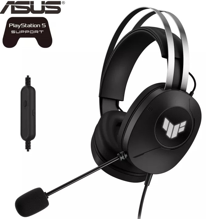 Wired gaming headset with 40 mm ASUS Essence drivers, virtual 7.1 surround sound, TeamSpeak-certified microphone, lightweight 297-gram design, durable ear cushions, plus symbolic TUF logo lighting