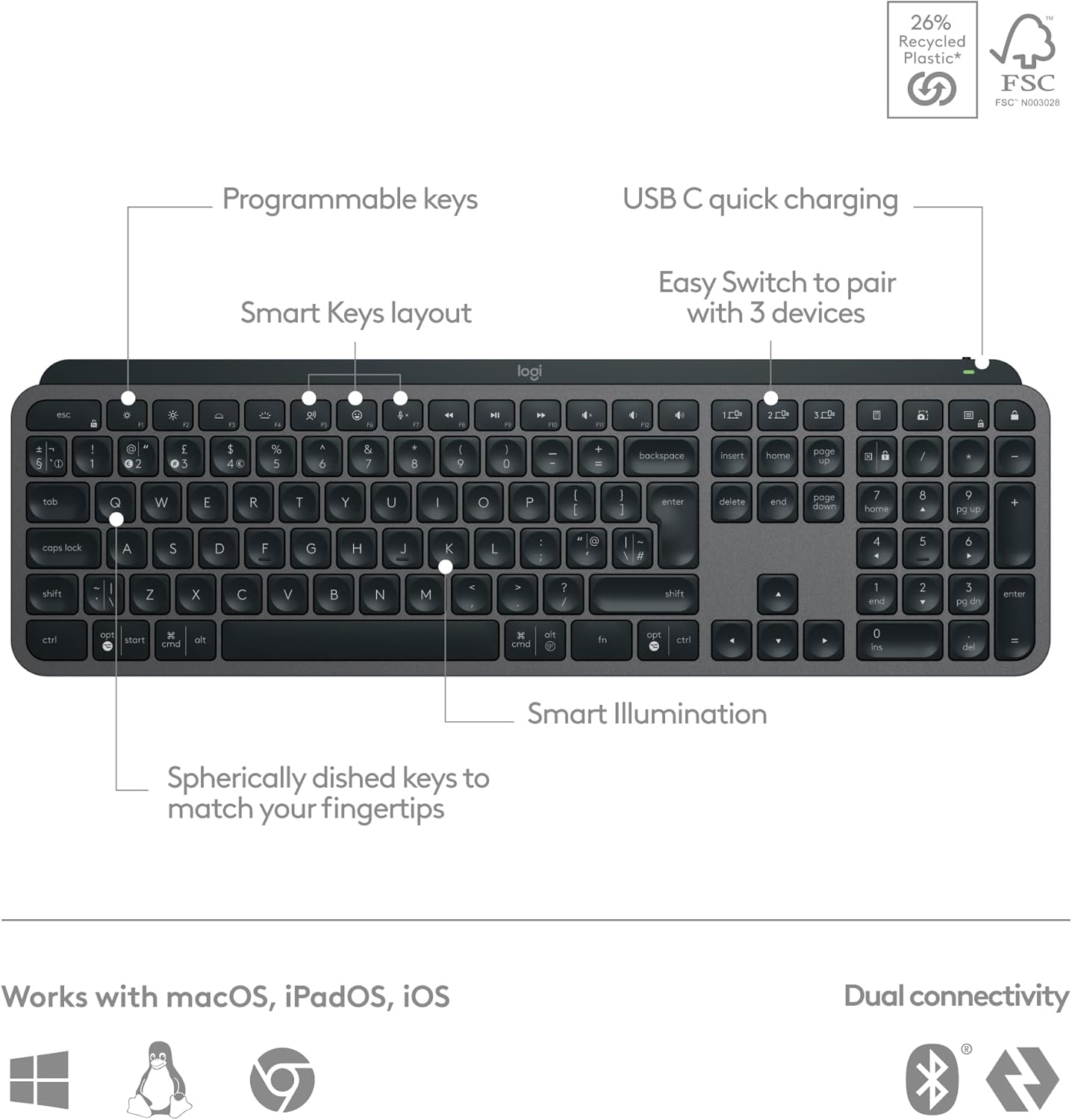 Connect via Bluetooth low energy technology or the Logi Bolt USB Receiver 2The keyboard is not compatible with other Logitech USB receivers