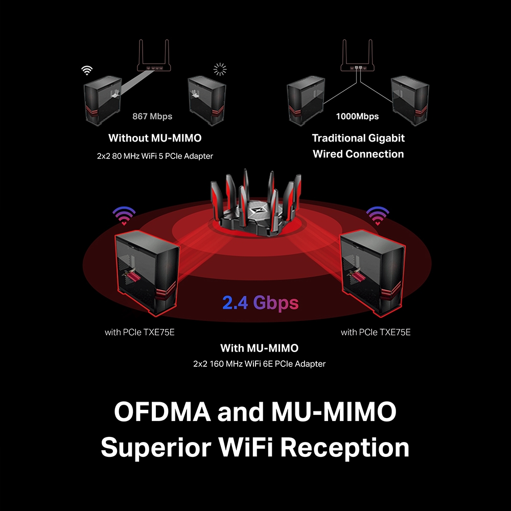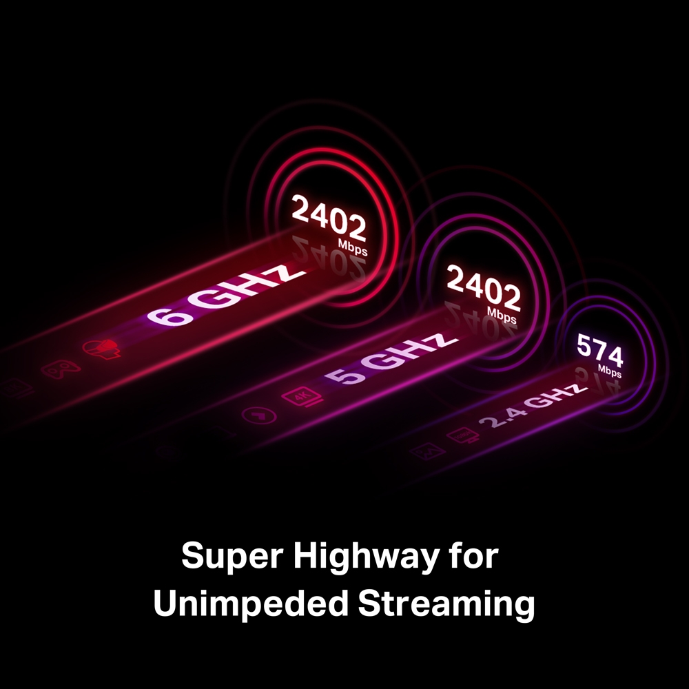 Unparalleled Tri-Band Speed — Boost your overall speeds up to 2402 Mbps (6 GHz) + 2402 Mbps (5 GHz) + 574 Mbps (2.4 GHz)